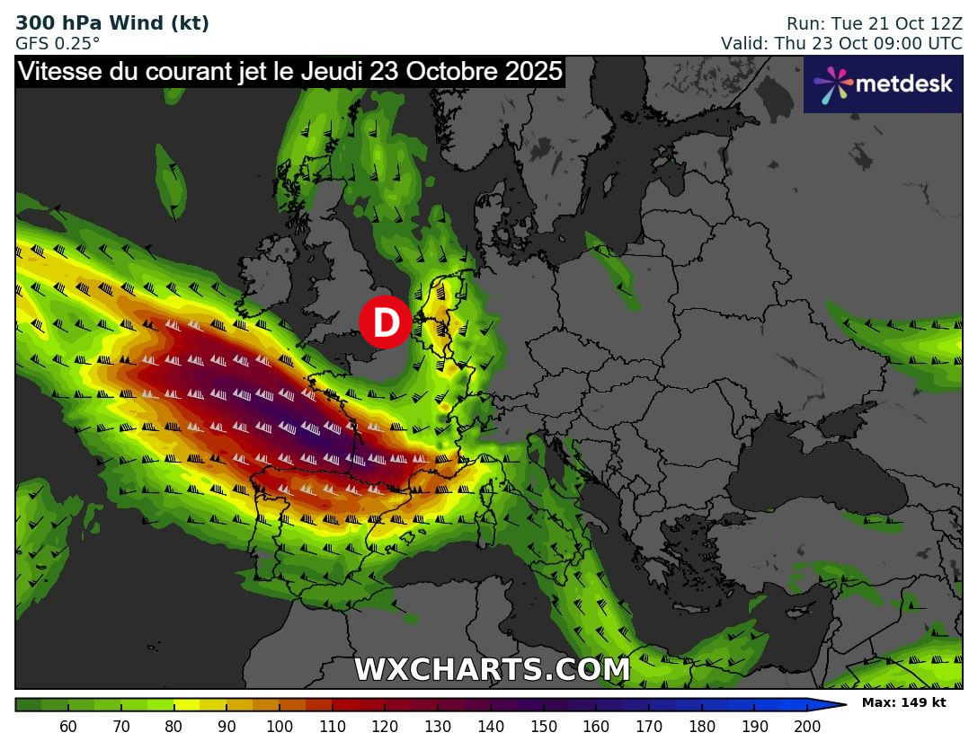 Vitesse du courant jet (vers 9000m) pour le jeudi 23 octobre 2025 – wxcharts.com