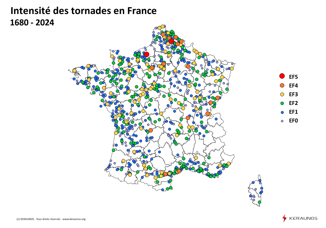 Tornades recensées en France de 1680 à 2024 et intensité (de EF0 à EF5) – keraunos.org
