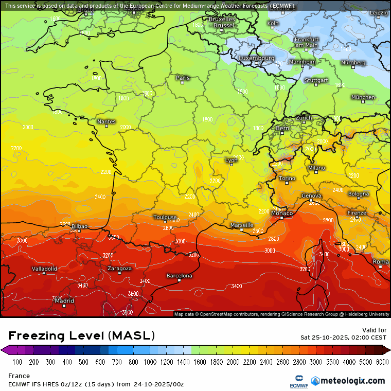 Altitude de l’isotherme 0°C du samedi 25 au lundi 27 octobre 2025 – meteologix.com