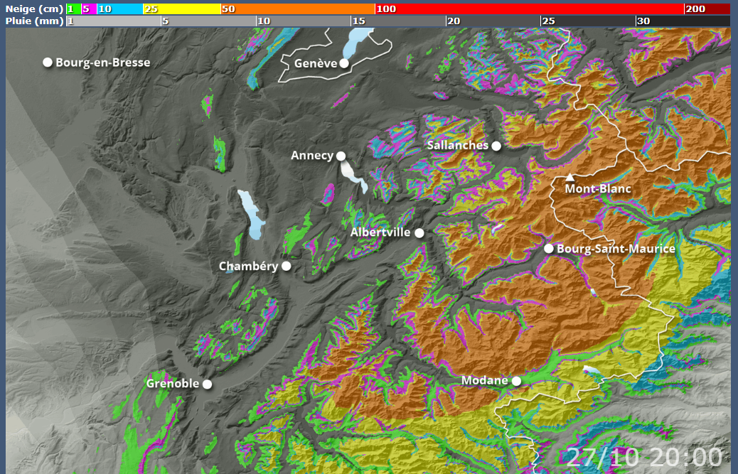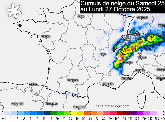 Cumuls de neige prévus sur les reliefs du samedi 25 au lundi 27 octobre 2025 – meteologix.com