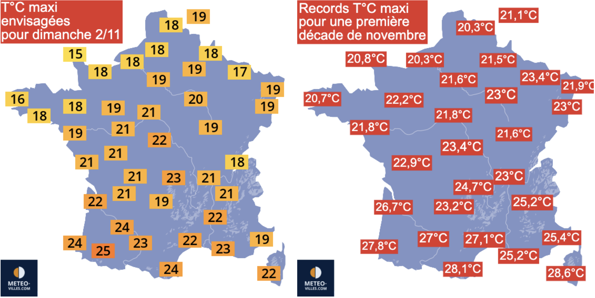 Voici les températures prévues pour dimanche. D’après les dernières données du 26 octobre, aucun record ne serait battu. Cela donne toutefois une idée de la douceur attendue par rapport aux records pour une première décade de novembre et les prévisions peuvent évoluer…
