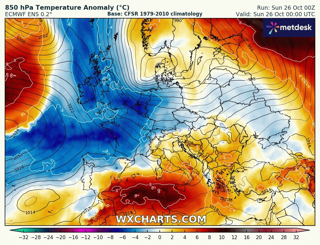 La journée de dimanche a constitué le pic de fraîcheur de cet épisode, avec des températures de 3 à 5 °C en dessous des valeurs habituelles pour une fin octobre. Il convient de rappeler que cette fraîcheur restait très localisée : au même moment, une grande partie de la Russie, des régions arctiques, du centre du Canada et du nord-ouest de l’Afrique connaissaient des anomalies chaudes, comprises entre +5 et +15 °C par rapport aux moyennes saisonnières.