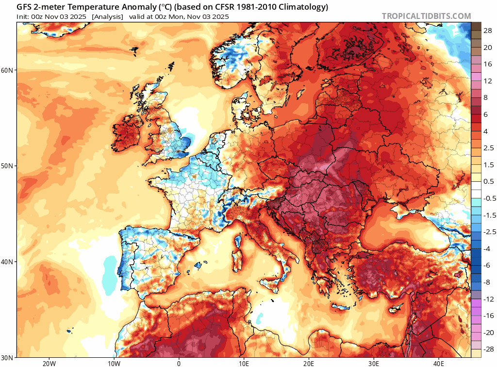 Animation des anomalies de températures à 2m sur l’Europe du 3 au 7 novembre 2025 – Via TropicalTidBits