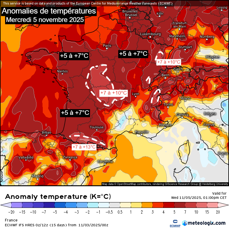 Anomalies de températures et valeurs maximales prévues sur la France ce mercredi 5 novembre 2025 – Meteologix