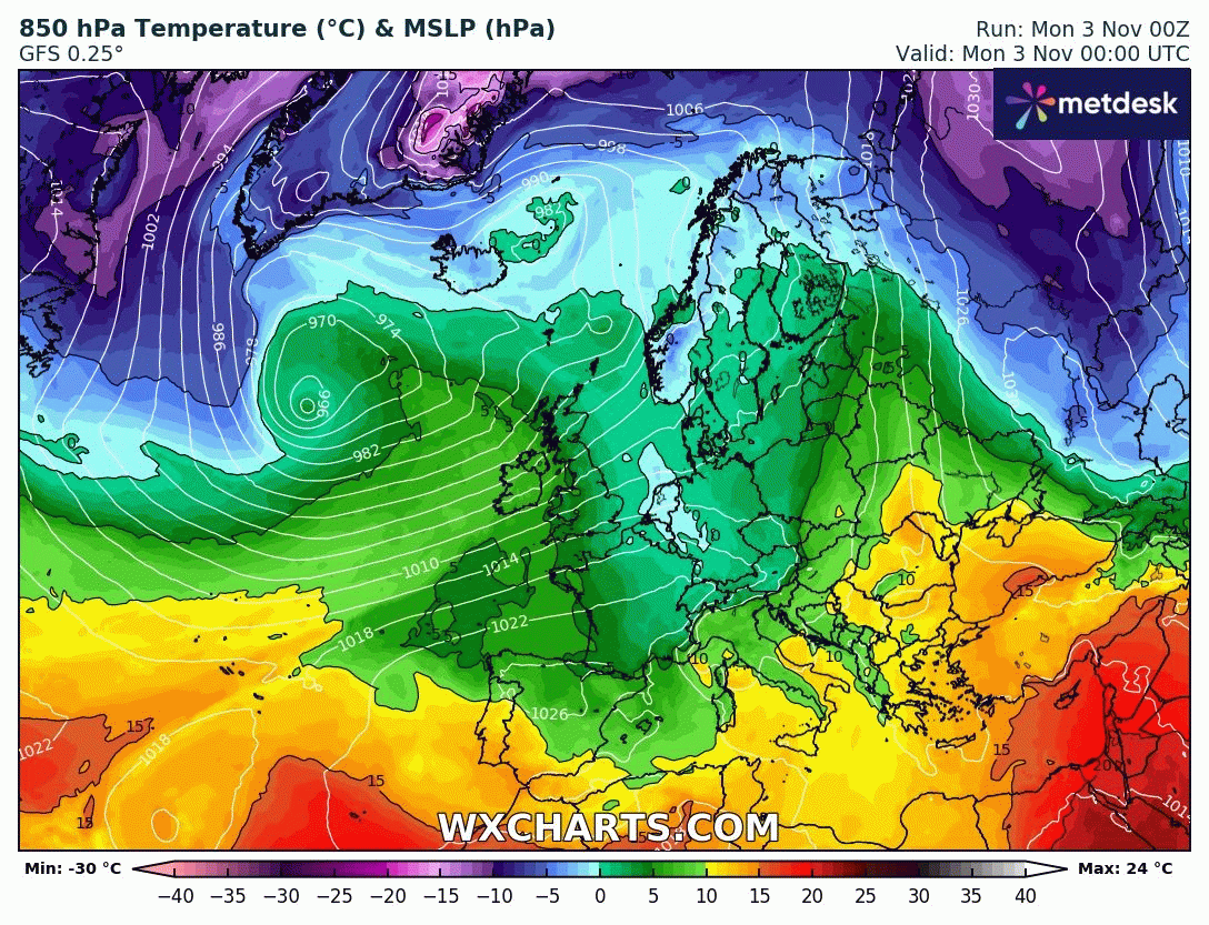 Animation des températures à 850 hPa sur l’Europe du 3 au 6 novembre 2025 – Modèle GFS via WX CHARTS