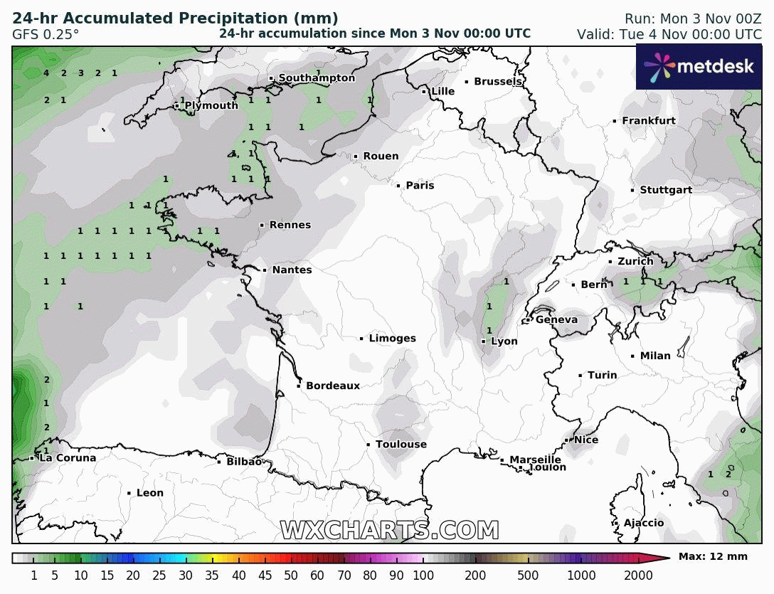 Évolution des cumuls de précipitations en 24h du 3au 9 novembre 2025 sur la France – Modèle GFS via WX CHARTS