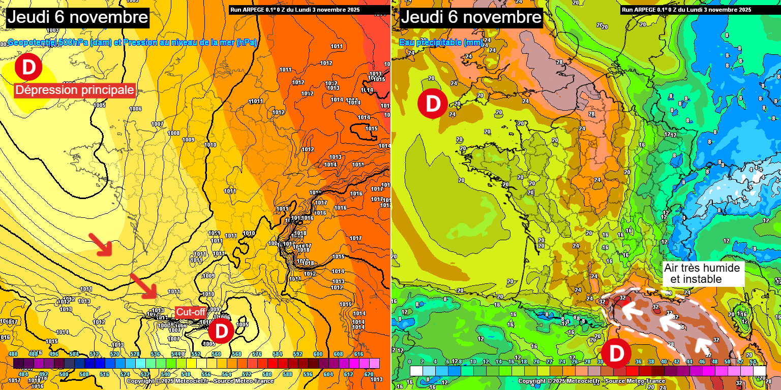 En effet, en marge d’une vaste zone dépressionnaire circulant sur l’Atlantique, un petit cut-off va s’étendre jusqu’à la Méditerranée entre jeudi 6 et vendredi 7 novembre, apportant de nouveau des conditions plus humides sur une partie de la France.