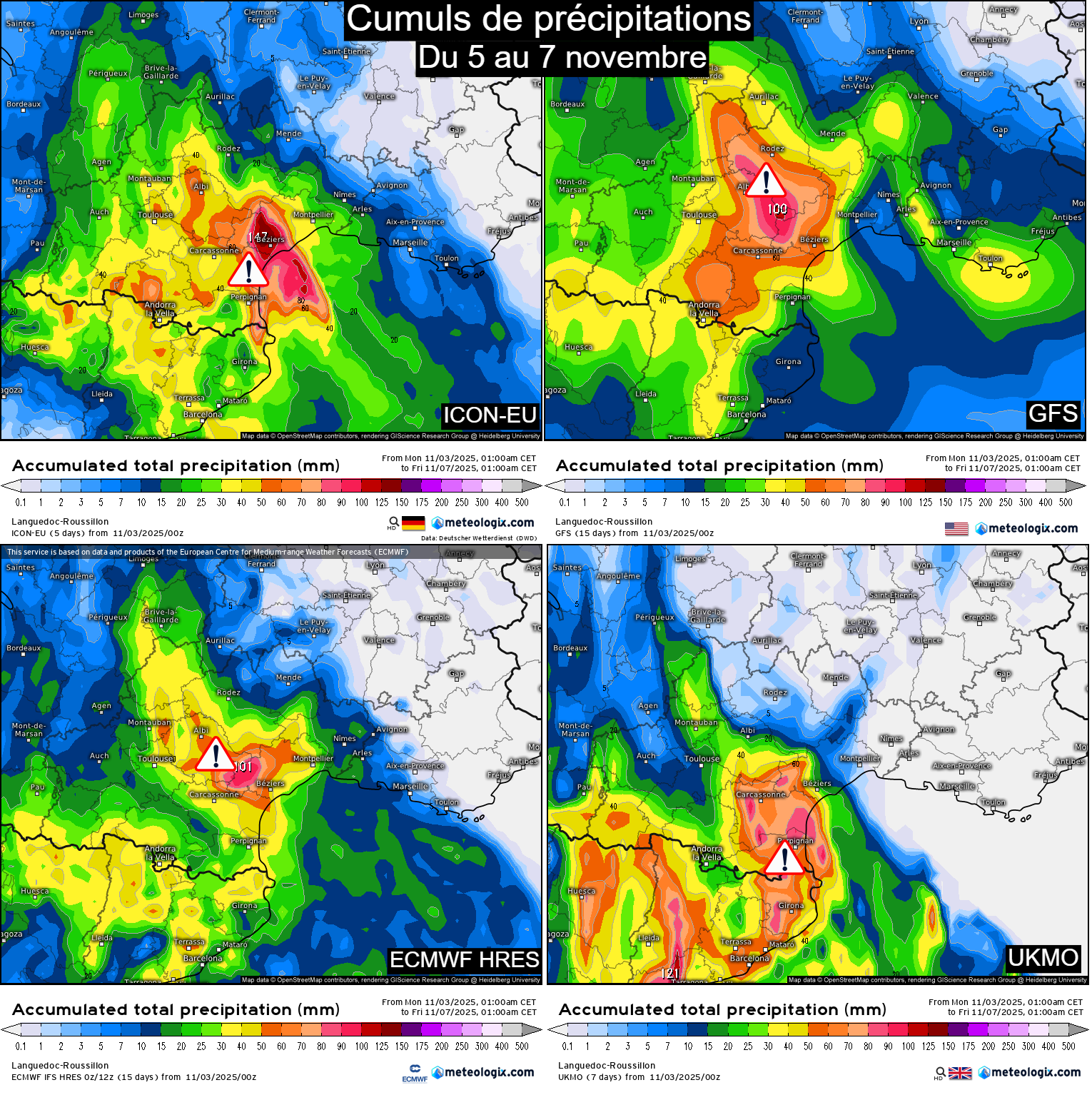 Comparaison de différents modèles concernant le risque d’importants cumuls de pluie sur l’Occitanie le 6 novembre prochain – via meteologix