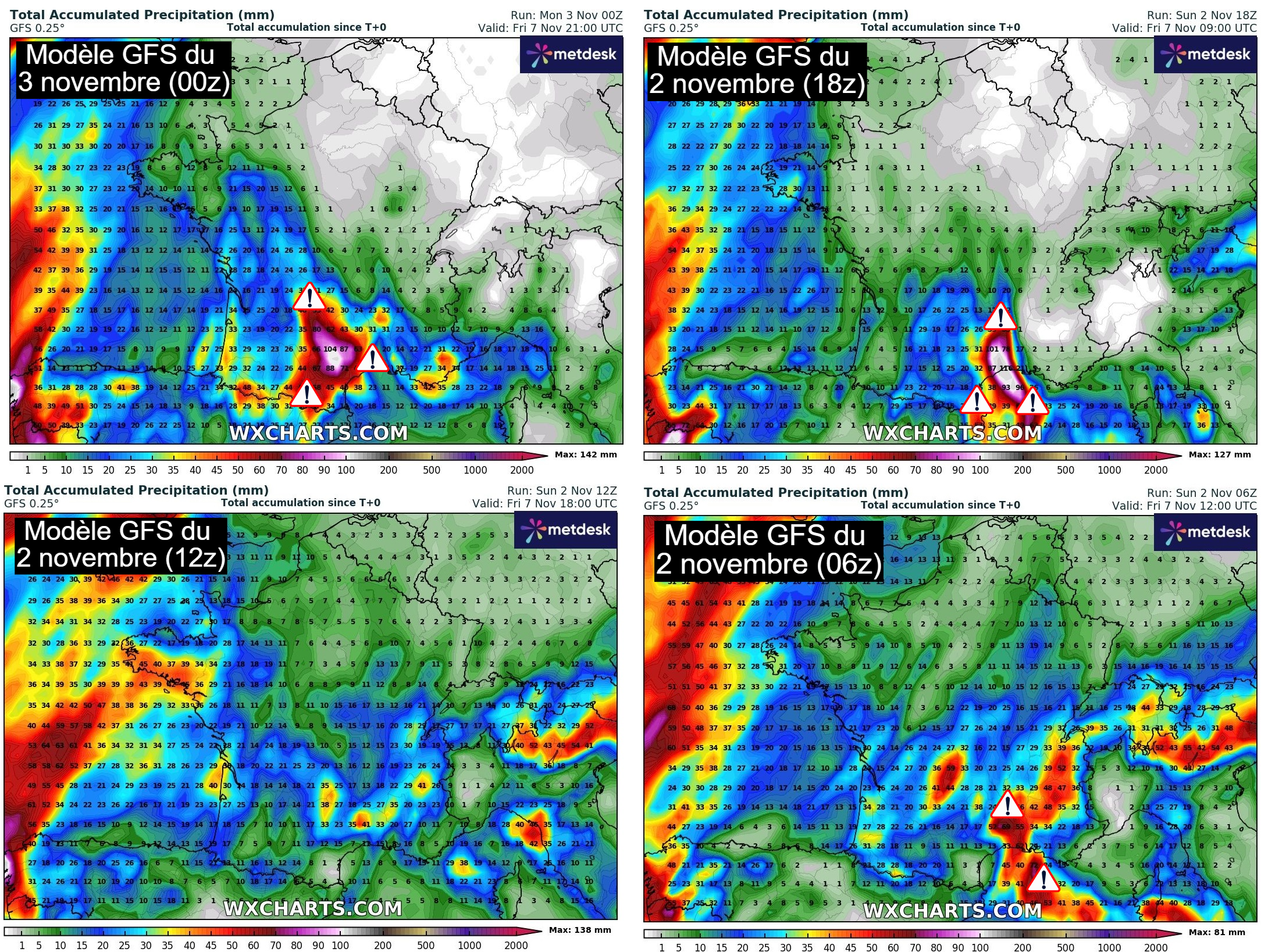 Il conviendra donc de surveiller la situation sur ces secteurs en journée du 6 novembre, le risque d’épisode pluvio-orageux potentiellement notable étant aujourd’hui prévu comme significatif. Les prévisions pourront toutefois évoluer, l’évolution de ce type de goutte froide étant difficile à appréhender avec précision à plusieurs jours de l’événement, en témoignent les dernières réactualisations du modèle GFS.