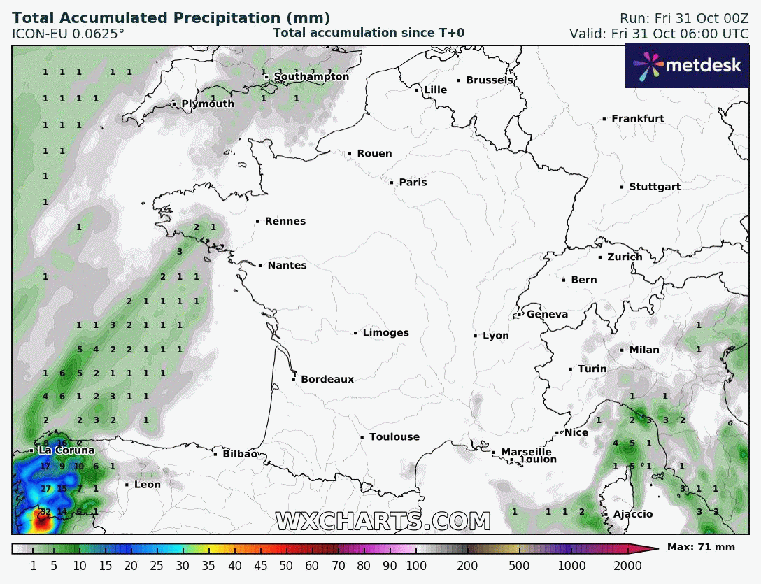 Animation des cumuls de précipitations sur la France jusqu’au dimanche 2 novembre au soir – Modèle ICON-EU via WX CHARTS