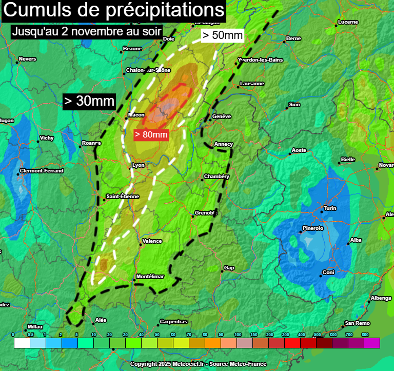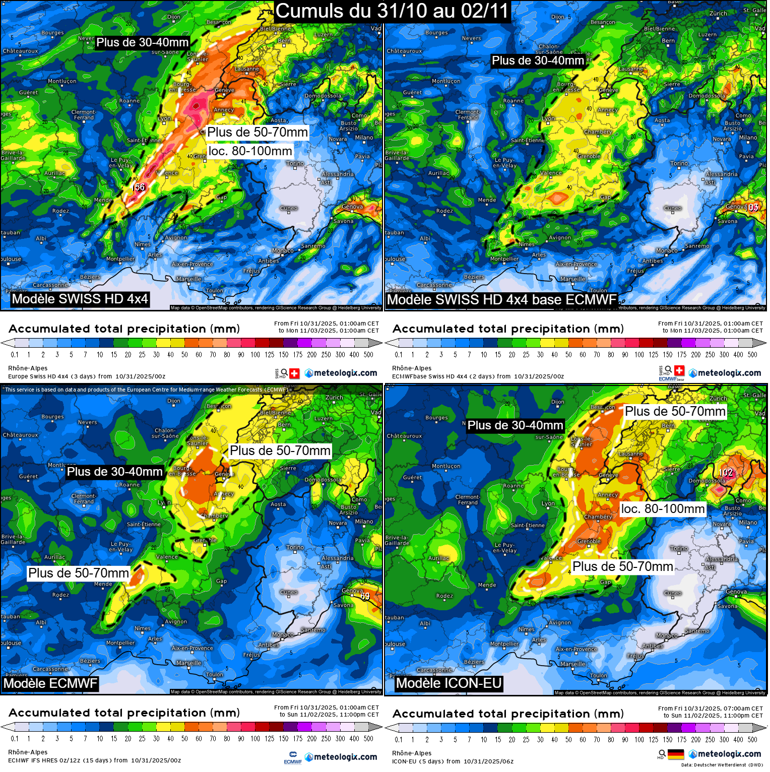 Des incertitudes persistent toutefois sur ces cumuls, ceux-ci pouvant aller du simple au double en fonction des modélisations. Certains scénarios envisagent par exemple de larges zones à plus de 70-80mm avec des pointes à plus de 90mm entre les reliefs ardéchois et l’Ain, tandis que d’autres restent plus raisonnables.
