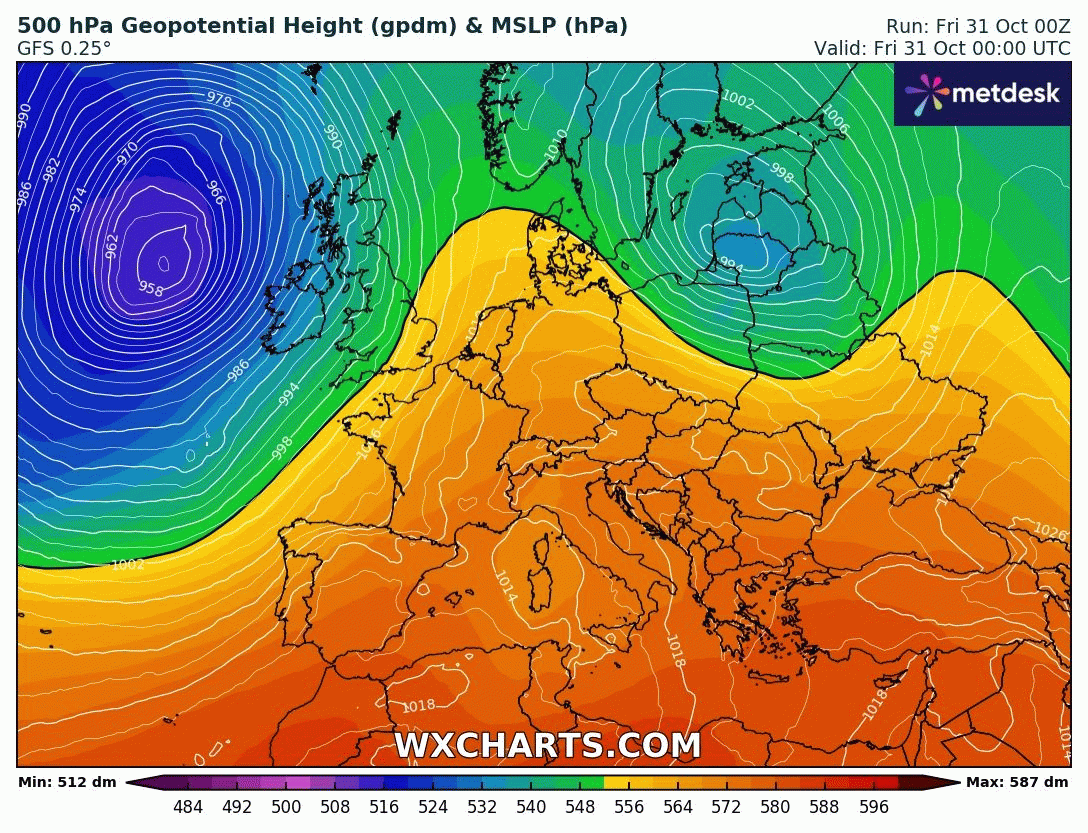 Animation des géopotentiels à 500hPa sur l’Europe du 31 octobre au 3 novembre 2025 – Modèle GFS via WX CHARTS