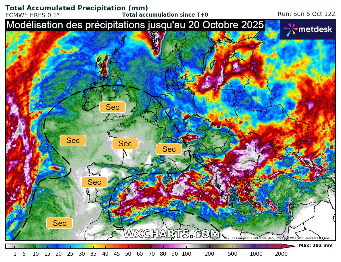 Lorsque l’on regarde les modélisations de précipitations pour les 15 prochains jours, les signaux sont particulièrement secs sur la France. Il n’y a quasiment pas de pluie attendue sur la période allant du 6 au 20 octobre 2025. Quelques fronts en fin de vie pourraient tout au plus atteindre le nord de l’hexagone puis, en fin de période, des averses pourraient déborder vers les Alpes, les Pyrénées ou la Méditerranée, en marge d’une instabilité faisant son retour en mer.