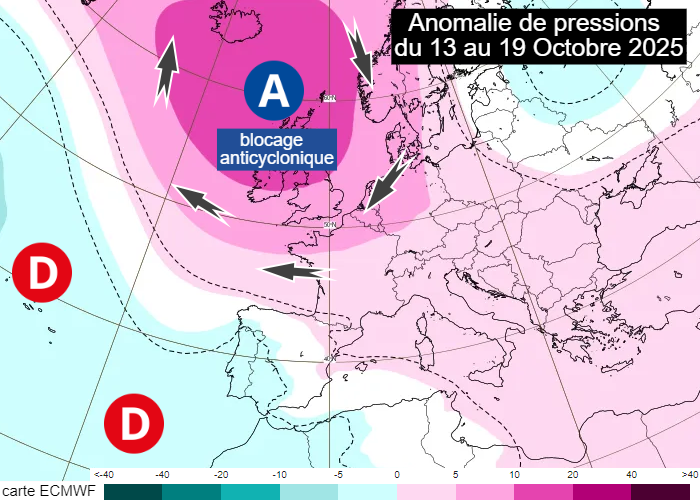 Ce blocage anticyclonique semble parti pour durer. En effet, les modélisations pour la semaine du lundi 13 au dimanche 19 octobre 2025 envisagent le maintien de l’anticyclone sur les Îles Britanniques, s’étendant peu à peu vers le nord en direction de l’Islande. Un flux d’est sec se maintiendrait donc sur la France, où les journées sèches et lumineuses auraient toujours l’avantage. Les basses pressions pourraient peu à peu gagner la péninsule ibérique. Il faudra alors surveiller, à terme, des débordements nuageux voire humides près de la Méditerranée.