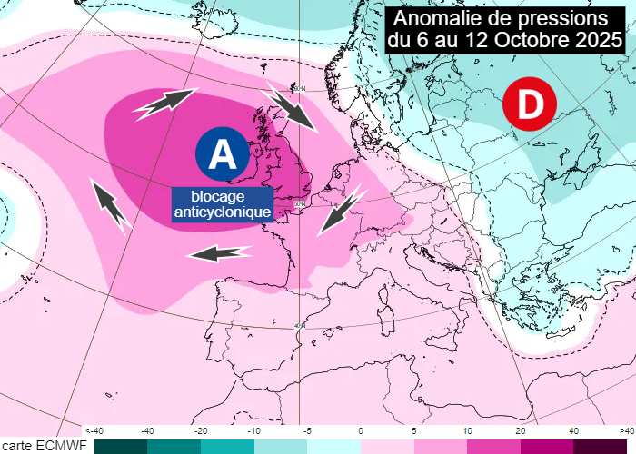 L’anticyclone regonfle actuellement au dessus de la France et ce dernier va s’ancrer durablement sur les Îles Britanniques dans le courant des prochains jours. On assiste à la mise en place d’un blocage anticyclonique qui influencera largement notre pays durant cette semaine du lundi 6 au dimanche 12 octobre 2025. L’anomalie de pression sur une semaine sera proche de +10 hPa en Manche, témoignant d’un anticyclone puissant. Nos régions verront la mise en place progressive d’un flux de nord-est dominant, advectant un air sec souvent propice à des journées lumineuses.