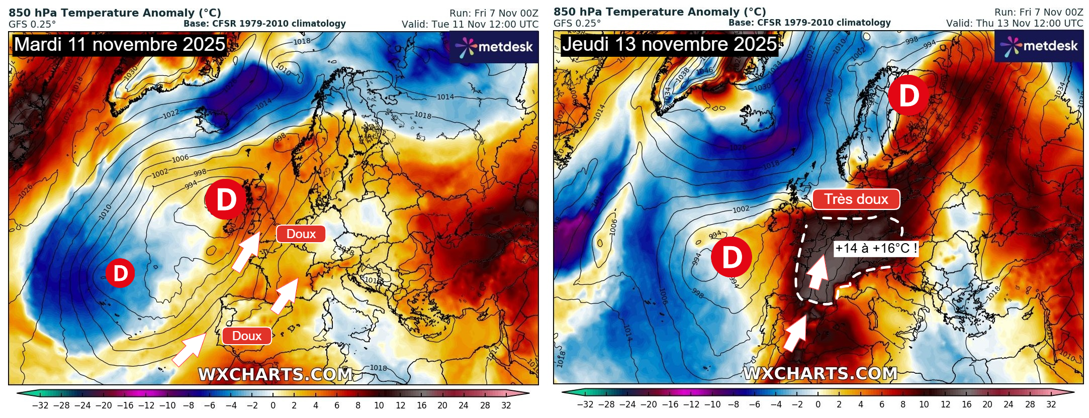 Anomalies de températures à 850 hPa sur l’Europe mardi 11 et jeudi 13 novembre 2025 – Modèle GFS via WX CHARTS