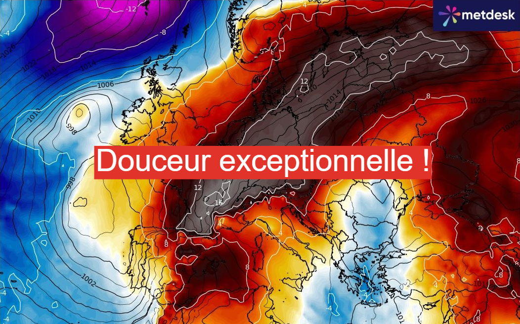 Cette baisse relative des températures sera néanmoins de courte durée. En effet, le flux va de nouveau basculer au sud-ouest la semaine prochaine en marge d’une nouvelle vaste zone dépressionnaire sur l’Atlantique, permettant à de l’air très doux de remonter vers la France dès le début de semaine. C’est néanmoins entre mercredi et vendredi que la douceur s’annonce la plus marquée avec des valeurs parfois 14 à 16°C supérieures aux normales de la période à 850 hPa.