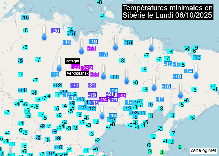Températures minimales du lundi 6 octobre 2025 en Sibérie – carte ogimet