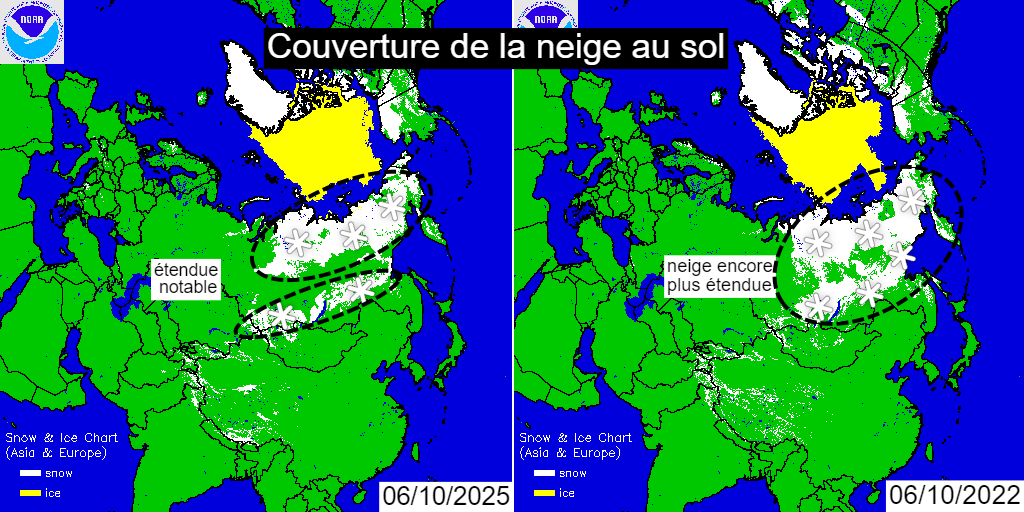 Étendue de la neige au sol (en blanc) sur l’Eurasie au 6 octobre en 2025 et en 2022 – NOAA