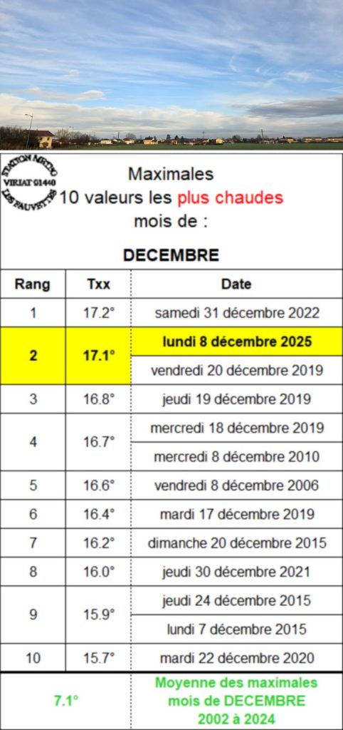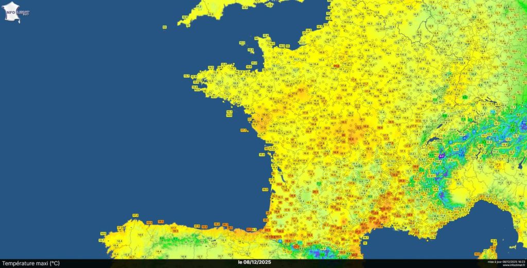 le 8 décembre 2025 à 19h19 40 records de douceurs battus en ce 8 décembre ! Merci Dr. Serge Zaka – Dr Zarge pour la reprise de nos cartes des températuresPhotos de la publication de Dr. Serge Zaka – Dr Zarge