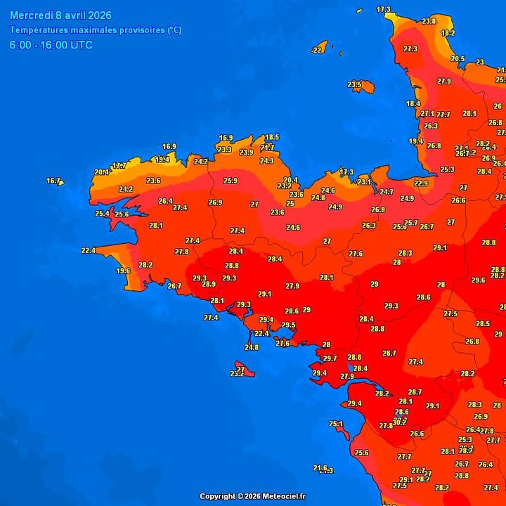 le 8 avril 2026 à 17h56 ☀️ Quelle chaleur en Bretagne et Normandie aujourd’hui. Près de 30°C sur le littoral du Morbihan. Chez vous aussi ? Attention au retour des orages entre le Bassin parisien et le Grand-Est jeudi. @super fans