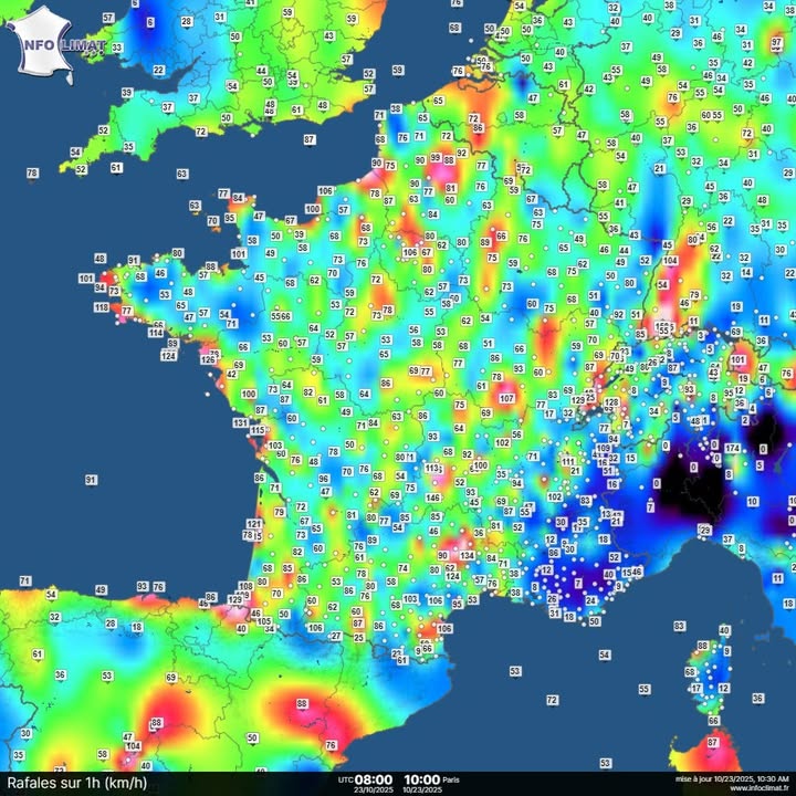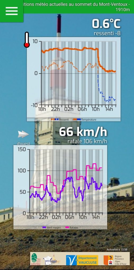 on 23 octobre 2025 at 19h53 🔴 DIRECT 16H00 : Le soleil est revenu sur l’ensemble du département y compris sur les reliefs avec de rares nuages par moments. Le vent de Nord-Ouest souffle assez fortement avec des rafales à 60 km/h en plaine, 80 à 90 km/h sur les hauteurs et même 100 km/h au sommet du Ventoux ce qui est classique. La tempête Benjamin concerne la quasi totalité du pays sauf la vallée du Rhône car nous sommes protégés par les Cévennes et le massif central qui font offices de barrage dans cette configuration. Cependant, l’air s’est bien refroidit en altitude après le passage de la perturbation. Au sommet du Ventoux, nous sommes passés de 8°C à quasiment 0°C en quelques dizaines de minutes. Cette fraîcheur sera également ressentie en fin de semaine jusqu’en plaine avec une baisse des températures. Infoclimat Parc naturel régional du Mont-Ventoux Département de Vaucluse