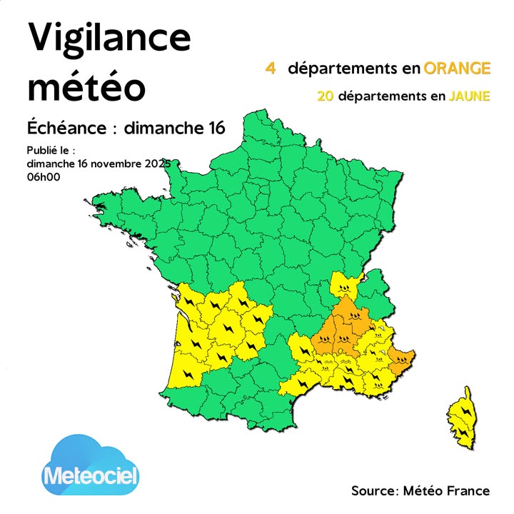 on 16 novembre 2025 at 19h34 Encore une douce journée, malgré la pluie matinale, pour débuter cette seconde quinzaine : 6.4°/15.4° vs 3.9°/10.7° pour les normales mais cela va changer la semaine prochaine🧤🧣 avec des températures attendues modérément sous les normales et enfin les premières gelées sous abri. Sur les 23 années de l’historique de mesure de la station, la 1ère gelée se produit en général le 11/11. La première quinzaine a été bine plus douce que la normale mais également bien arrosée comme vous pouvez le constater sur le tableau d’analyse.Photos de la publication de Météo-Viriat