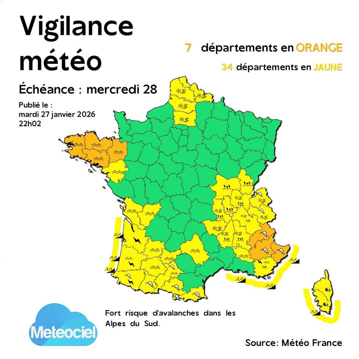 le 27 janvier 2026 à 22h14 7 départments sont en #VigilanceOrange Vigilance #Crue sur la Bretagne avec la Laïta (29), Blavet (56), Oust (22, 35, 56). Fort risque d’#avalanches dans les Alpes du Sud avec des des quantités de neige importantes attendues au dessus de 1800 m générant une activité avalancheuse significative.