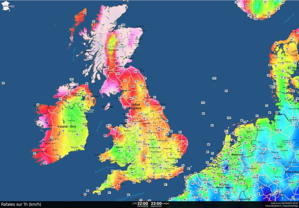 on 4 octobre 2025 at 13h07 Tempête AMY en Irlande 122 km/h à Mace head 122 km/h à Belmullet 148 km/h à Malin Head 148 km/h à Magilligan 118 km/h à Ballypatrick Forest Tempête AMY en Ecosse 182 km/h à Aonach More 183 km/h à Cairnwell 169 km/h à Bealach Na Ba 135 km/h à Loch Glascarnoch 130 km/h à Inverbervie 122 km/h à Inverness Tempête AMY au Pays de Galles 138 km/h à Capel Curig 138 km/h à Lake Vyrnwy Tempête AMY en Norvège 223 km/h à Folgefonna topp (1390 m d’alt. et des vents de tempête > 100 km/h durant 29 heures consécutives dont 2 heures consécutives à plus de 200 km/h) 175 km/h à Reinsfjellet 171 km/h à Spørteggbu 166 km/h à Juvvasshoe 158 km/h à Utsira Fyr 158 km/h Buholmrasa Fyr 155 km/h à Vinjeora 139 km/h à Sylarna 137 km/h à Obrestad 133 km/h à Midtstova 133 km/h à Trolledalsegga 130 km/h à Hemsedal A noter qu’à son passage, on a enregistré une pression de 947.9 HPA à Baltasound sur l’île de Portland, dans l’archipel des Shetlands, soit la pression la plus basse pour un mois d’octobre, un cran en dessous le précédent record de 950.9 HPA en 1988.Photos de la publication de Infoclimat