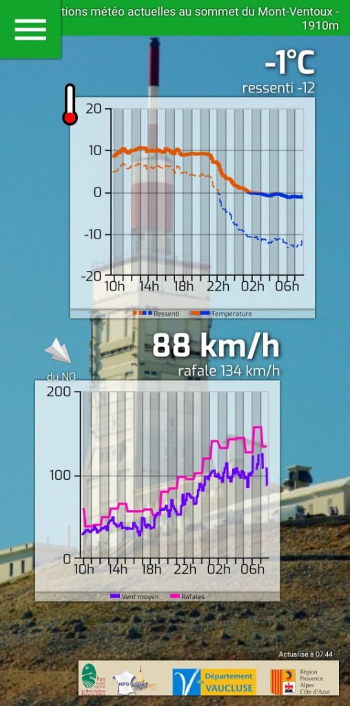 on 5 octobre 2025 at 7h22 🔴 AMBIANCE POLAIRE Comme prévu, l’air froid a gagné notre département durant la nuit et a provoqué une chute notable des températures notamment au sommet du Ventoux. Il ne fait plus que -1°C, ressenti -12/-13 au vent et des rafales qui dépassent parfois 150 km/h 🥶🥶 ➡️ Données en direct : https://www.infoclimat.fr/observations-meteo/temps-reel/mont-ventoux-sommet/VENTOUX.html Infoclimat Département de Vaucluse